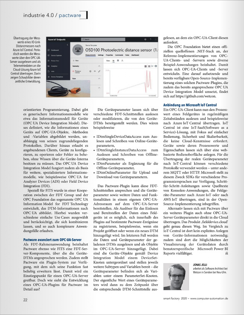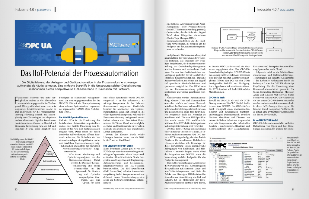 In the special edition of Computer & Automation (Smart Factory 2020 Special Issue), our article on “The IIoT Potential of Process Automation” and the use of PACTware in conjunction with our OPCUA4PACTware plugin was published (more information here). Alternatively, you can also read the article here by clicking on the images: